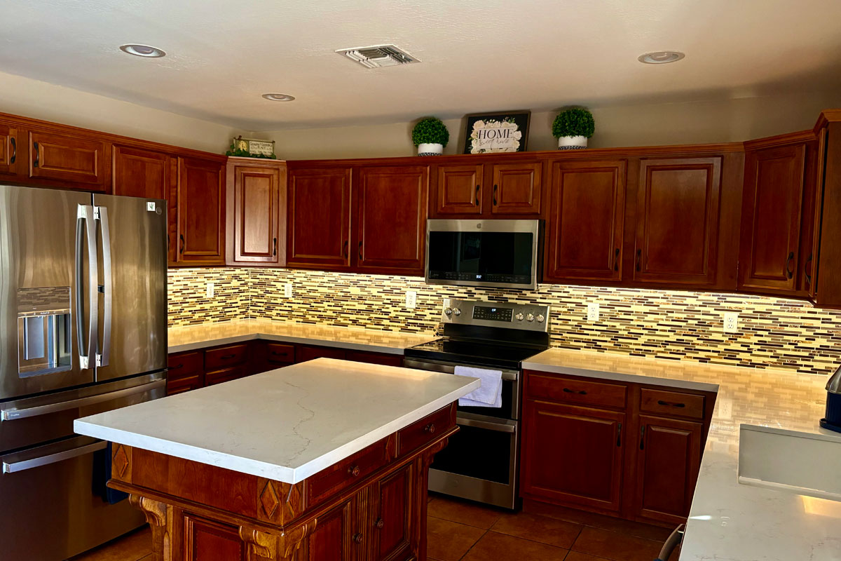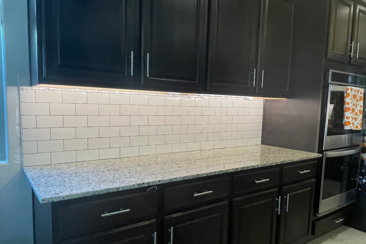 Clients choose under-cabinet lighting because it provides focused task lighting exactly where they need it, eliminating shadows on countertops while cooking or prepping. It also enhances the overall look of the kitchen by adding warmth, depth, and a high-end feel, creating comfortable ambient light without relying solely on overhead fixtures.